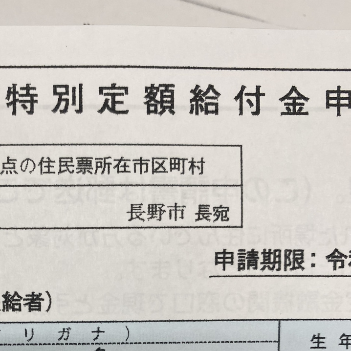 特別定額給付金の申請用紙。