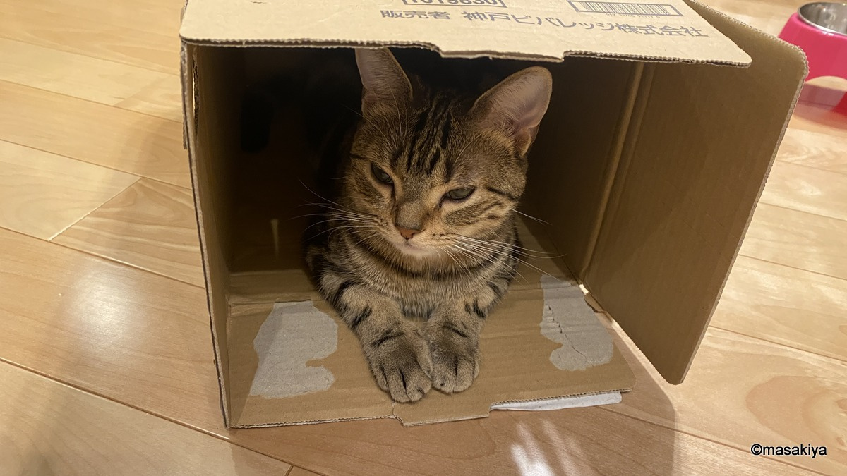 箱 正木屋日記 2021.11.25 #正木屋日記 #ネコ 先日、スーパーで買物をしてきて、その時にもらってきた箱をおいておいたら、ちゃっかり入っておりました。つい、箱があると入ってしまうようです。別の箱です。やっぱり入ってしまいます。箱と同じような色だから好きなのか、箱が好きなのか、理由はよくわかりませんが、お陰でなかなか箱が捨てられなくなりました。。。箱、邪魔ですね。。。 next おもちゃ 2021.11.26